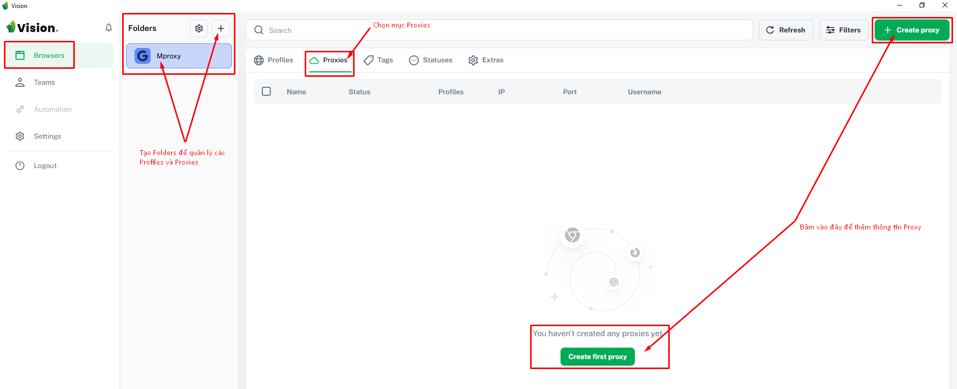 Để cấu hình trên phần mềm Vision Browser các bạn hãy chuẩn bị sẵn sàng phần mềm được cài đặt và kích hoạt, các gói proxy phù hợp trên Mproxy.vn