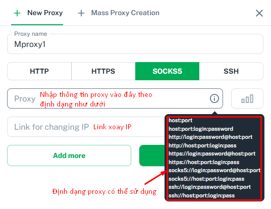 - Proxy: nhập thông tin proxy theo định dạng có sẵn trên Mproxy