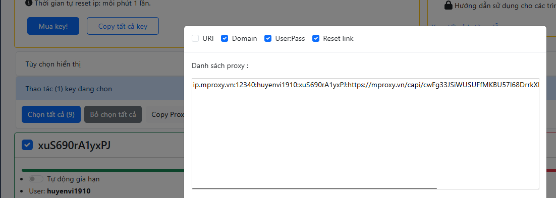 - Thông tin proxy sau khi tích đủ các thông tin như trên sẽ bao gồm tất cả thông tin về IP/Server:Port:Username:Password:Link reset IP