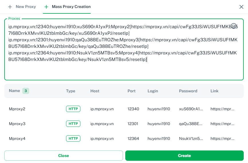 - Bấm Create để lưu thông tin các proxy vào phần mềm