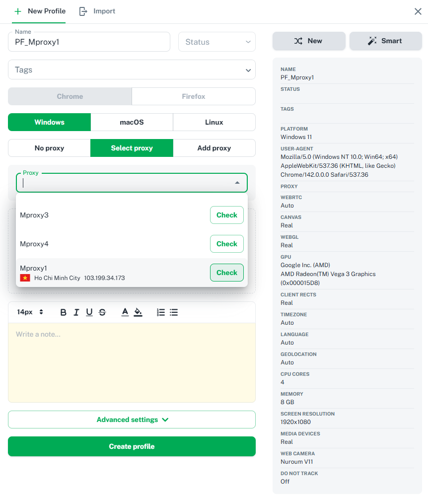 - Chọn proxy đã lưu ở mục Select proxy: trước khi gán proxy cho profile các bạn có thể bấm Check để kiểm tra lại hoạt động của proxy trước khi thêm