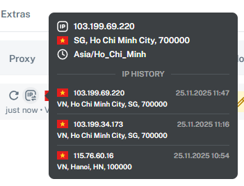 - Với các bộ proxy được lưu trên phần mềm các bạn có thể xem được lịch sử các địa chỉ IP đã từng hiển thị với proxy