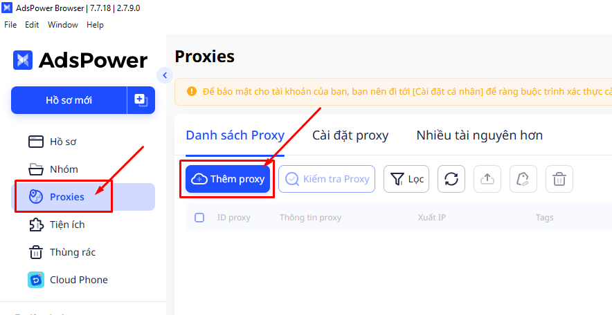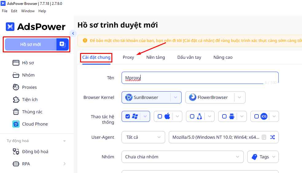 - Chọn Proxy để thêm proxy cho hồ sơ
