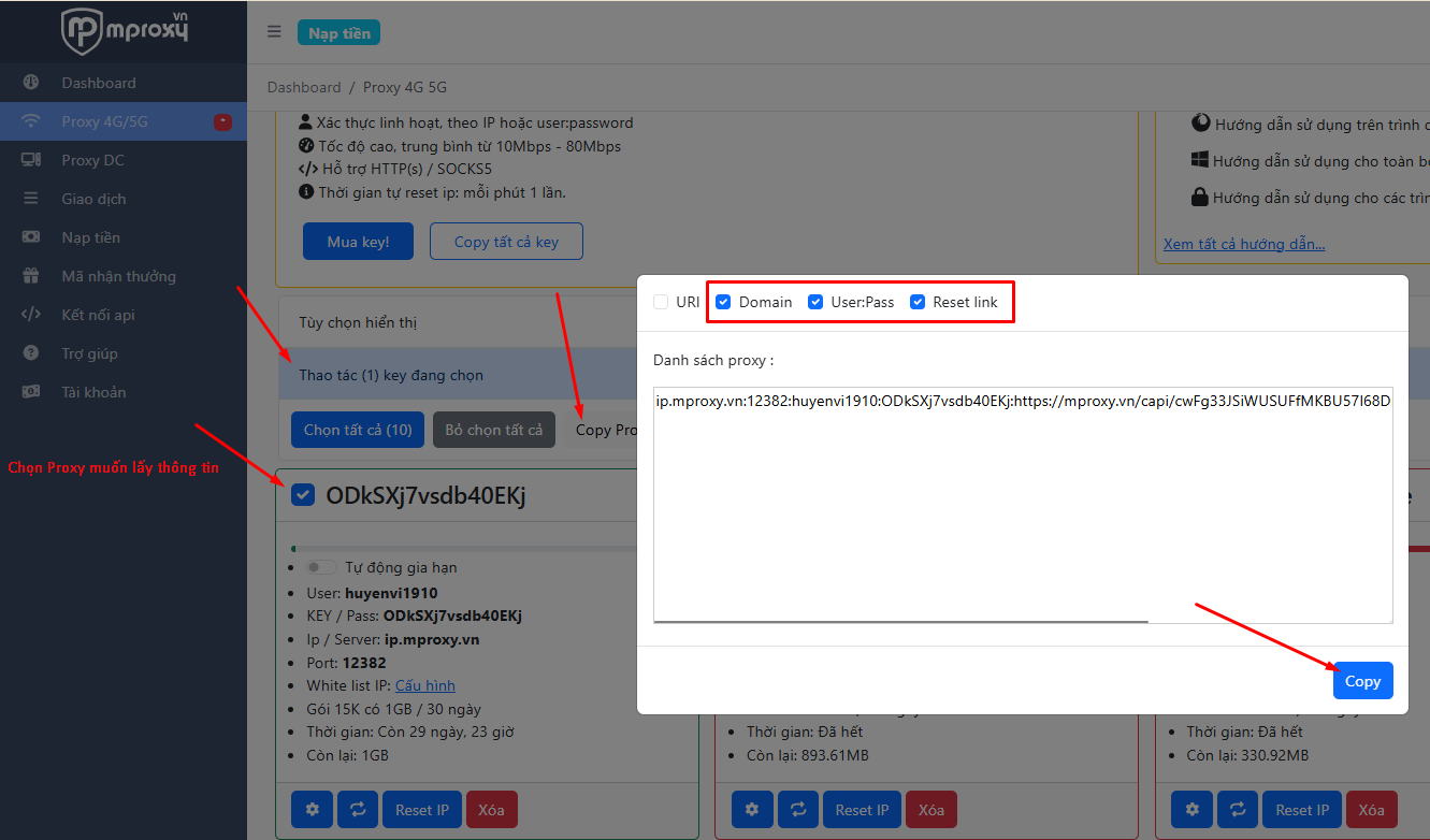 Trên Mproxy, chọn proxy muốn lấy thông tin