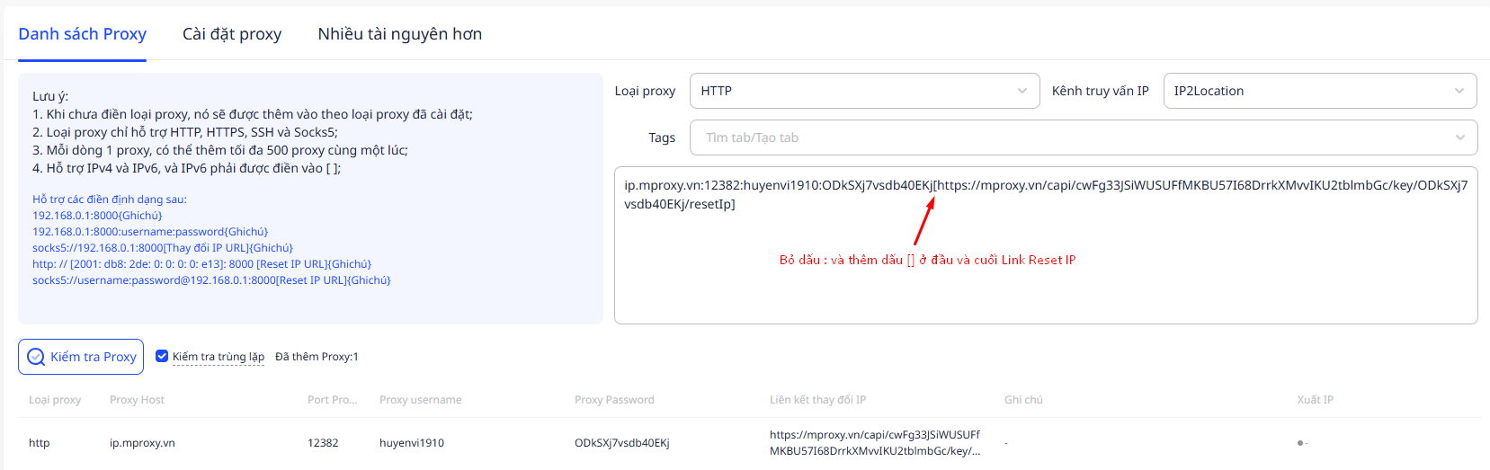 Để thêm proxy vào phần mềm AdsPower CÓ link Reset IP các bạn cần thay đổi 1 vài ký tự để nhập thông tin được chính xác theo định dạng trên AdsPower
