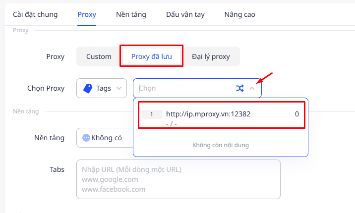 - Chọn mục Proxy đã lưu để chọn proxy đã nhập ở Bước 2