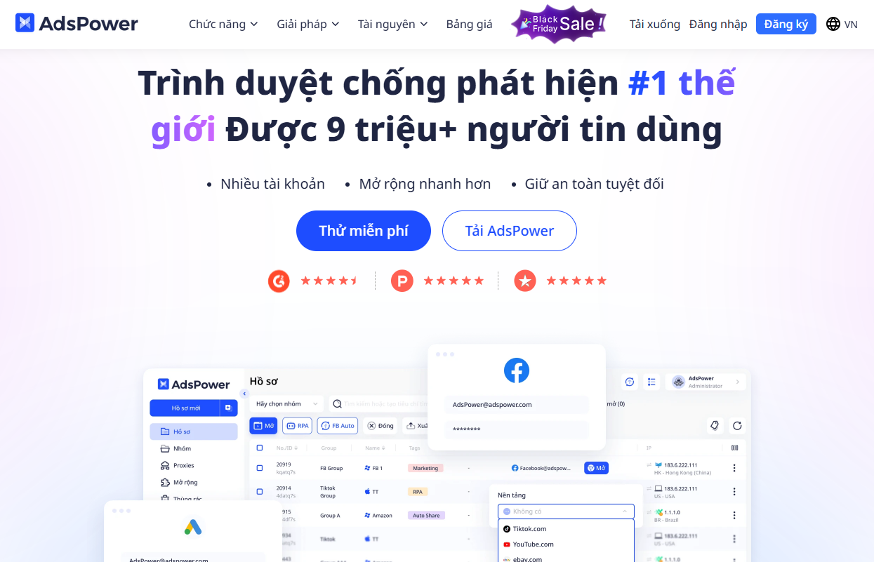 Phần mềm AdsPower là phần mềm tạo ra hàng loạt các trình duyệt chống phát hiện giúp cho người dùng thực được bảo vệ bởi lớp ngụy trang thông tin hoàn toàn khác nhau trên mỗi trình duyệt được tạo ra.