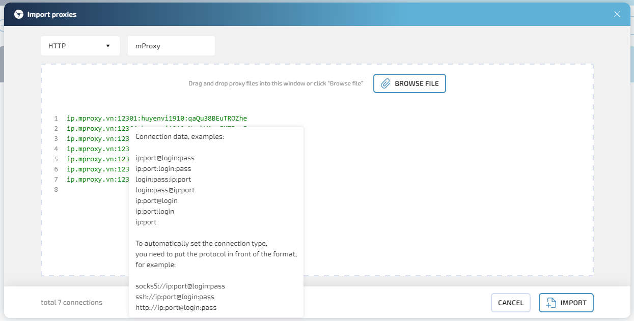 ⚠️ Lưu ý: Định dạng của mProxy các thông tin được ngăn cách bằng dấu hai chấm (:) IP:Port:User:Pass còn định dạng trên Linken Sphere được hiển thị là IP:Port@Login:Pass.