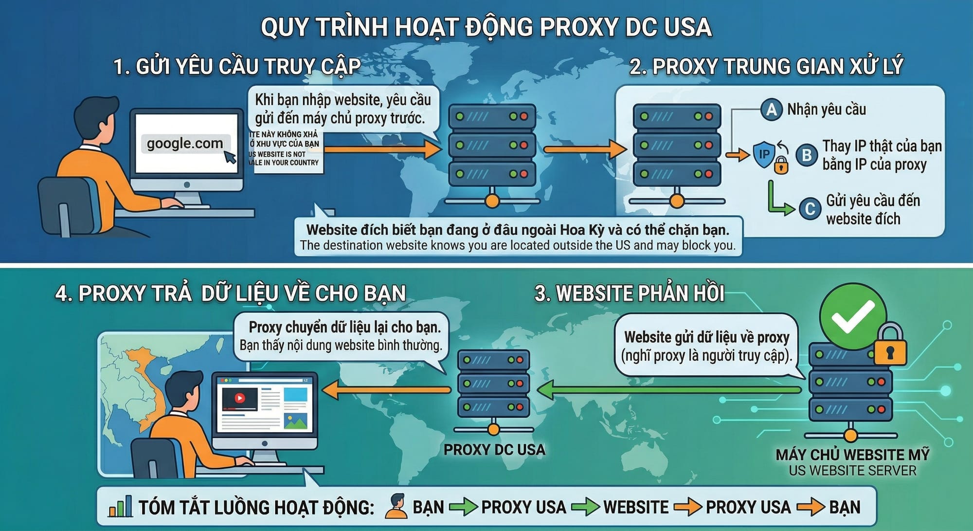 Cuối cùng, proxy chuyển dữ liệu lại cho bạn → bạn thấy nội dung website như bình thường.