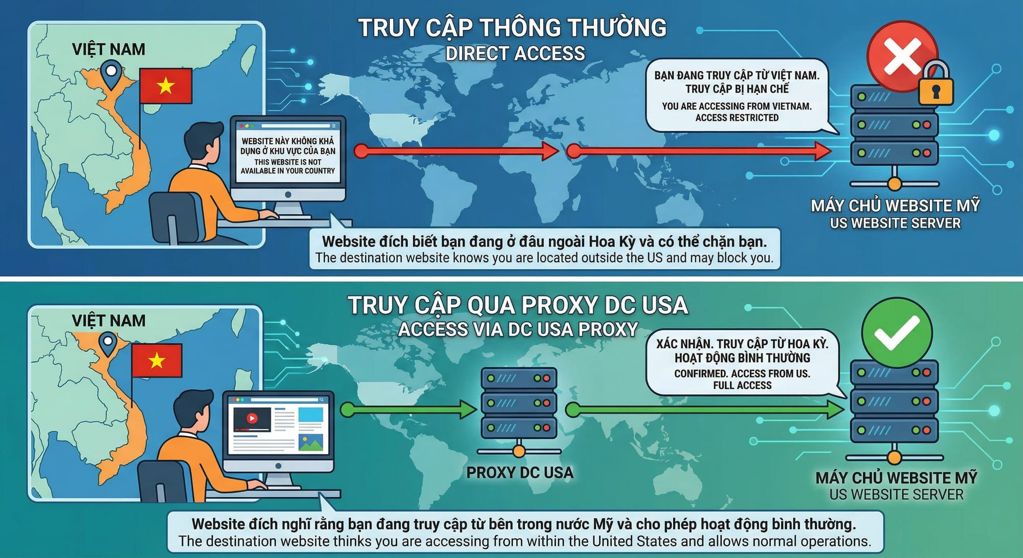 Hiểu đơn giản bạn đang ở Việt Nam, khi truy cập vào các website bên Mỹ bằng cách truy cập thông thường, website đó sẽ đánh dấu bạn đang truy cập từ Việt Nam hoặc có thể không truy cập được nếu website đó chặn các luồng truy cập từ ngoài lãnh thổ.